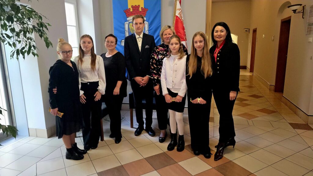 Dla petentów i pracowników urzędu utwory Fryderyka Chopina zagrali: Magda, Hania, Julia, Weronika i Tymek, którzy po występach zapozowali do wspólnego zdjęcia z panią Sekretarz Gminy Łucją Foltyn.