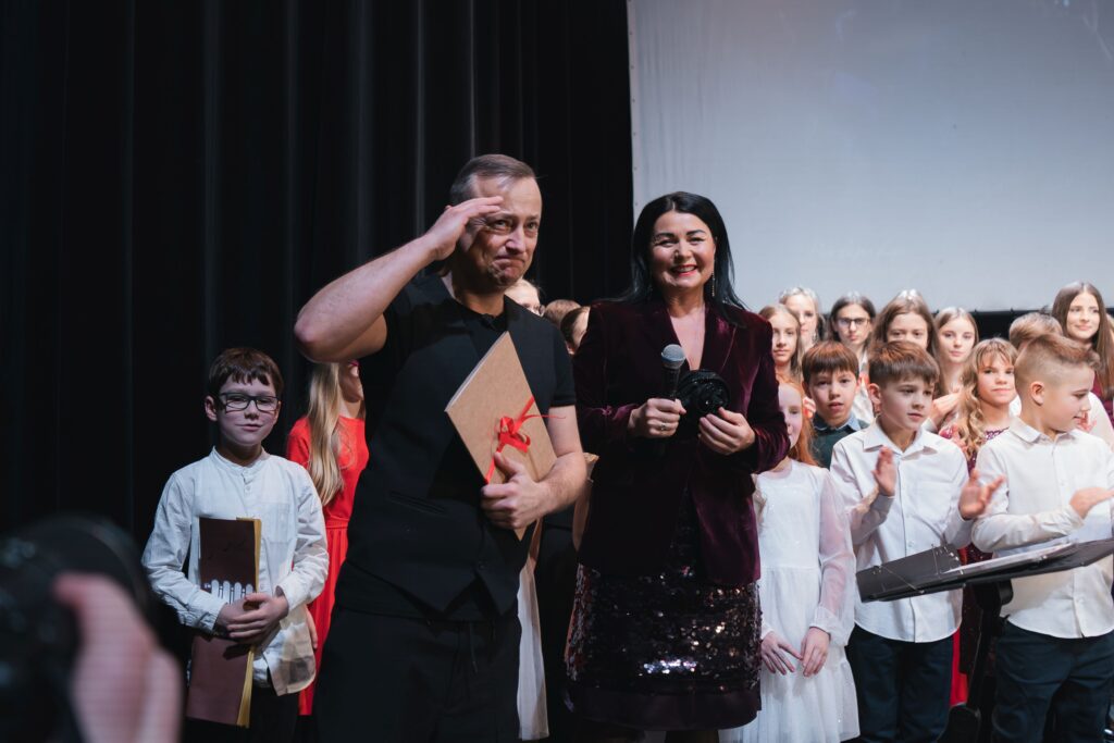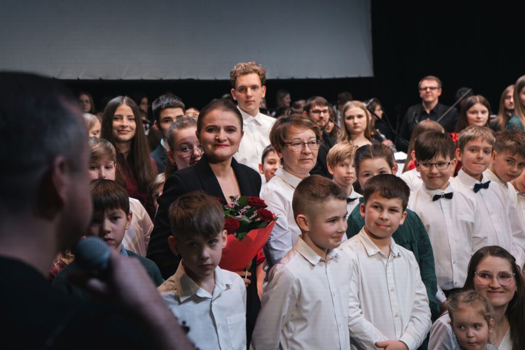 Joanny Wiktorko – dyrektora Ogniska Muzycznego w Pszczynie wraz ze świętującą jubileusz 70-lecia Ogniska ekipą uczniowsko-nauczycielską